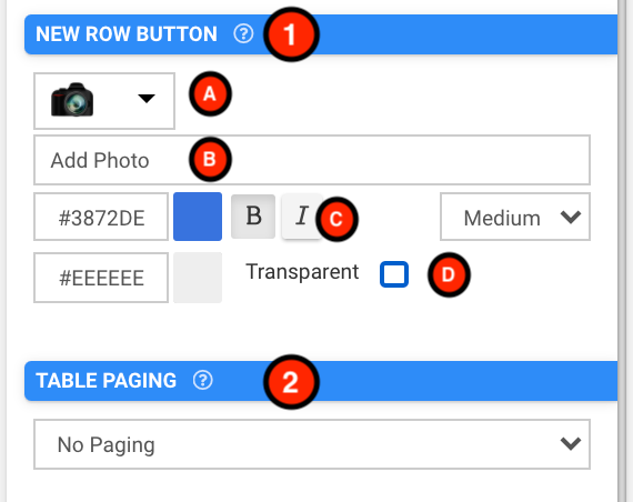 Customize the button that allows the user to add new rows to the Table. If this is left blank, a standard button is shown with text of 'Add Row' or local equivalent.
