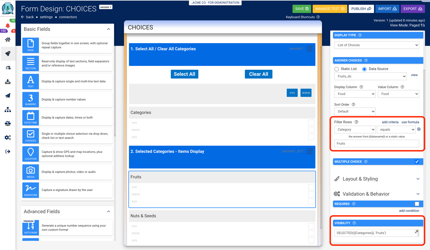 In our example Form, “Fruits” is the main category, and under this are berries, apples, bananas, etc. So, when the category “Fruits” is selected in your first Choices Field, the subsequent Choices Fields will filter based on that category.