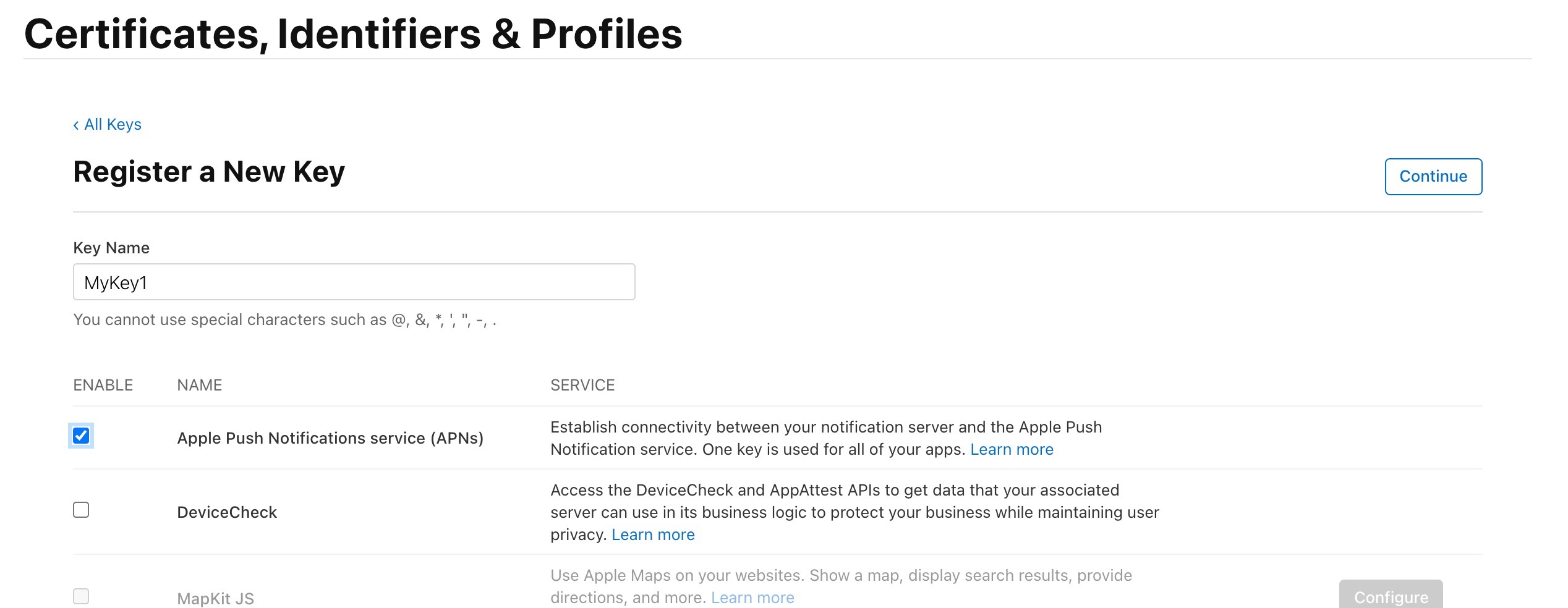 - Fill out a name for your key in the "Key Name" field and enable APNs by ticking the respective checkbox.
